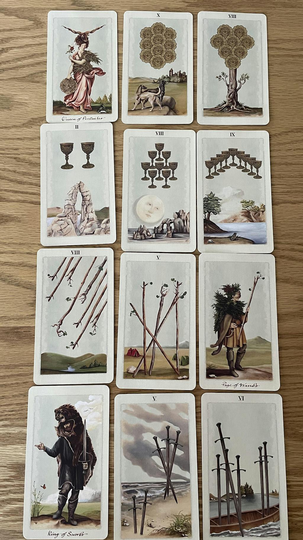 All imagery in this 84 card deck is hand painted using traditional oils by Linnea Gits and all copy is hand lettered by Peter Dunham. The deck is inspired by the visual beauty of nature, early Celtic mysticism and the luminous beauty of Renaissance paintings.